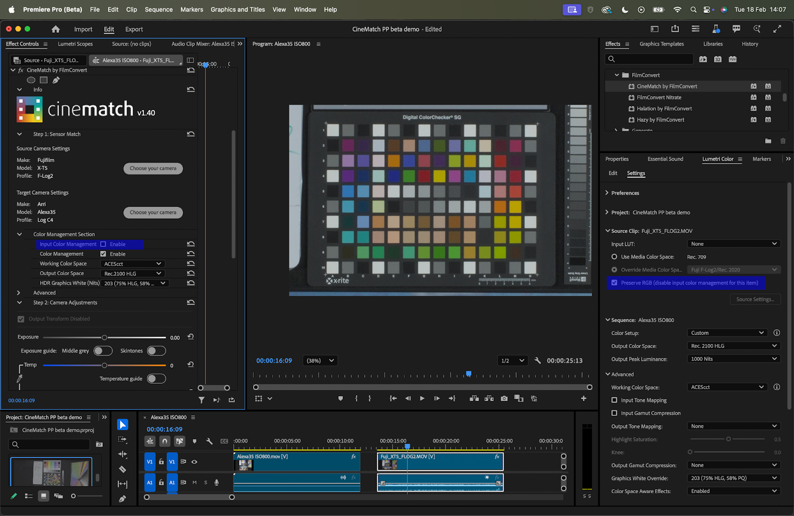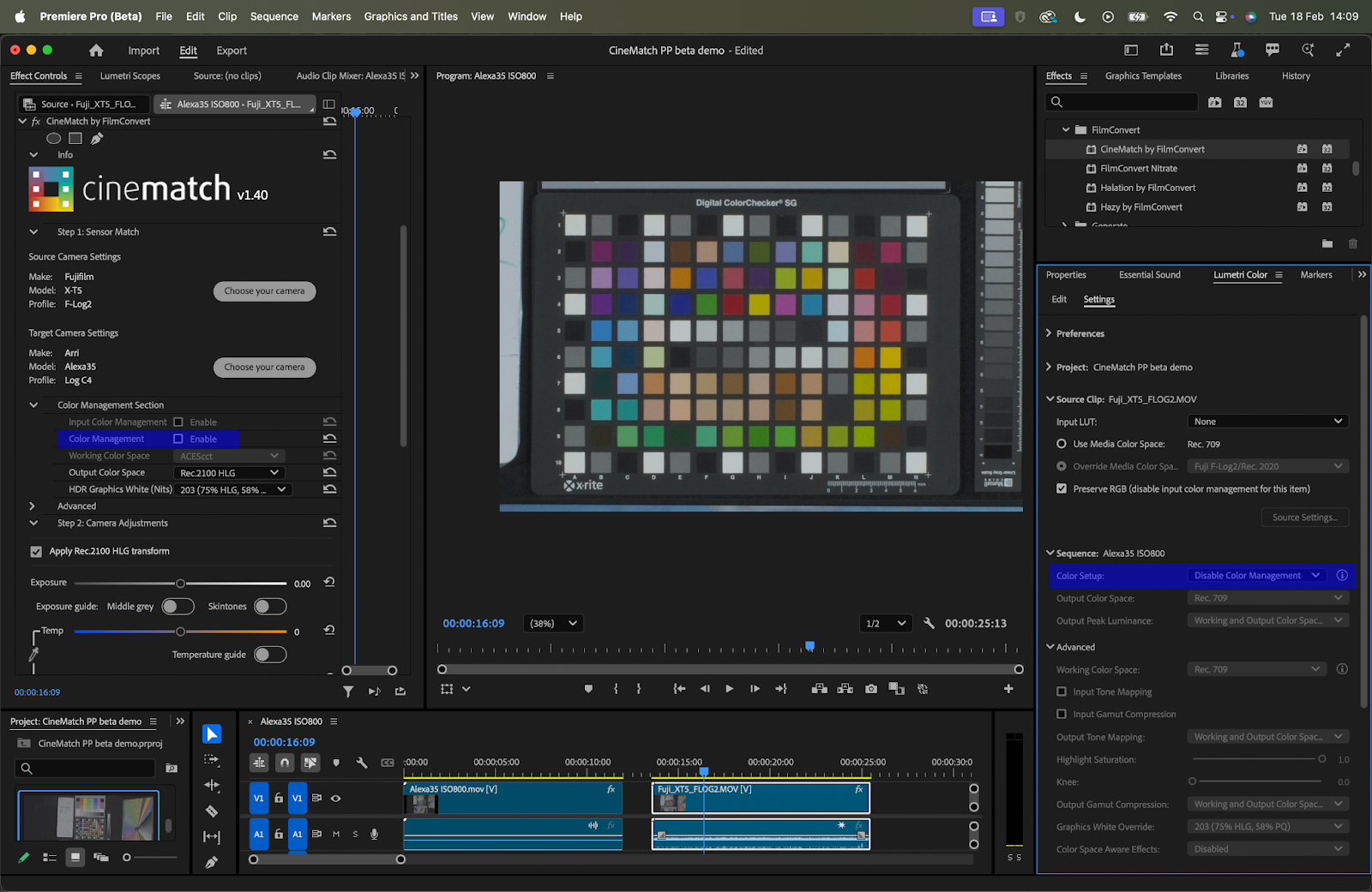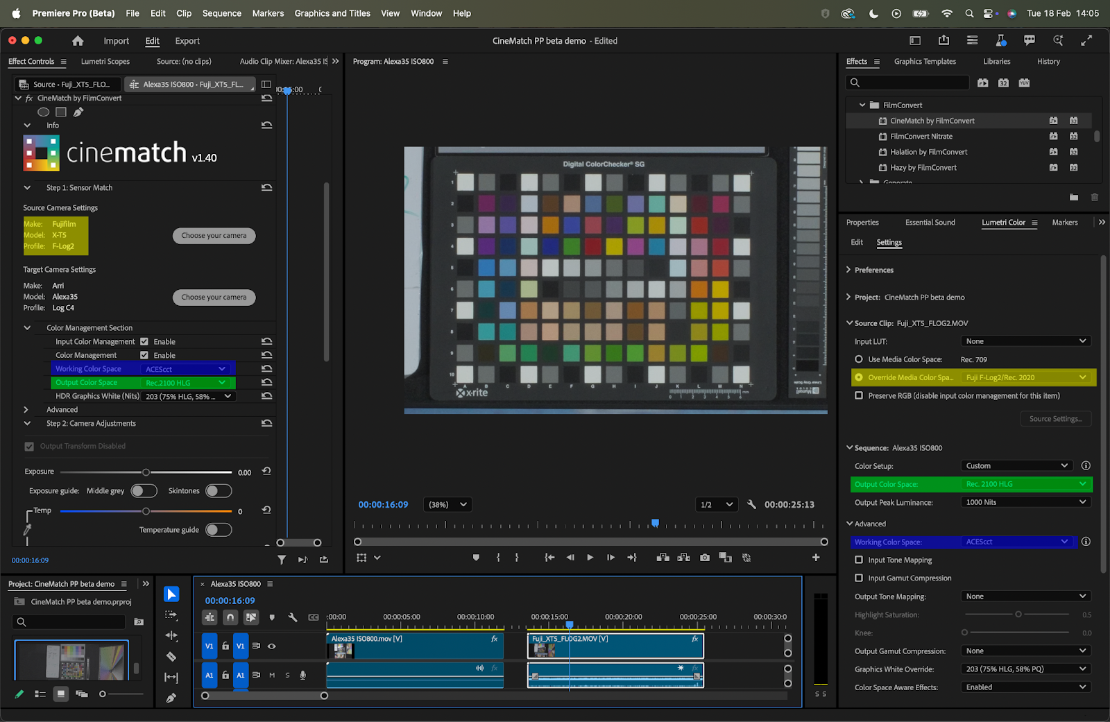 CineMatch has been updated to work with the new color science features in Premiere Pro v25.2. Specifically, CineMatch now supports Premiere Pro’s working color spaces, Rec.709, Rec.2100 HLG, Rec.2100 PQ, ACEScct and the output color spaces, Rec.709, Rec.2020, Rec.2100 HLG and Rec.2100 PQ.