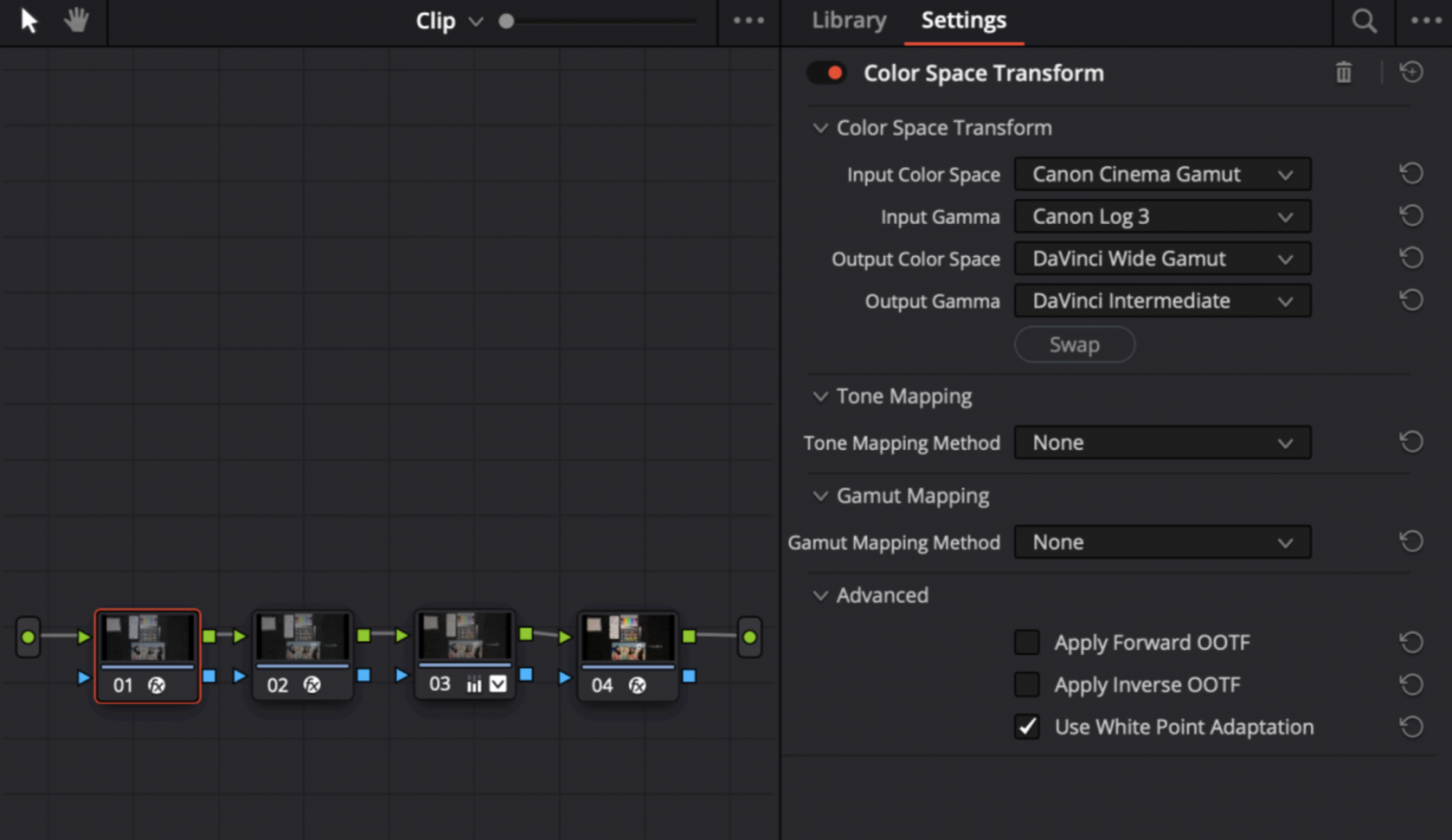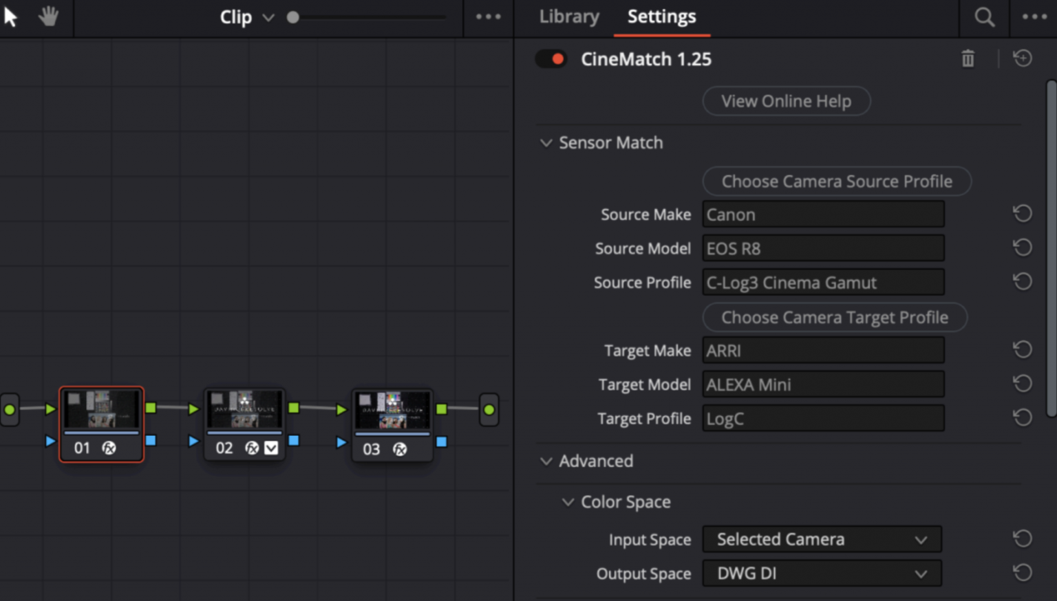 Tip: Put CineMatch on a node in the “Timeline” node tree instead of the “Clip” node tree for the Rec. 709 transform and False Color guides. This will apply the effect to every clip so you can easily spool through clips and match. Just set the source camera settings in CineMatch on the “Timeline” node to the Camera settings that all the “Clips” are targeted to.